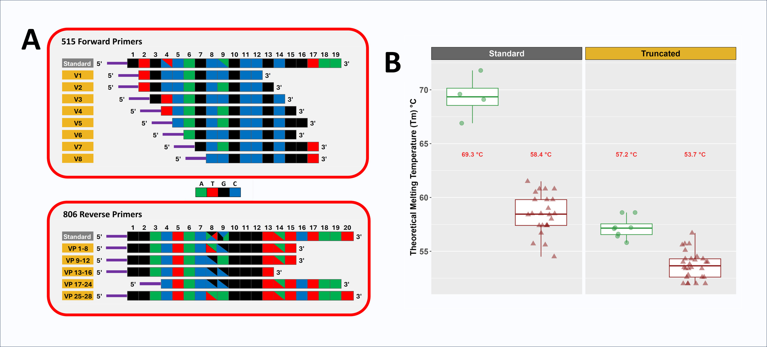 The Earth Microbiome Project (EMP) primers, the 515 forward primer (referred to as ‘515F’) and 806 reverse primer (referred to as ‘806R’), were used in PCR amplification of genomic DNA (gDNA) as the standard primer set.4,6–8 These primers target the V4 variable region of microbial 16S small subunit (SSU) ribosomal RNA (rRNA) genes. Melting temperatures were estimated using the OligoAnalyzer Tool 3.1 calculator,9 assuming primer concentrations at 250 nM, 2 mM Mg2+, and 0.2 mM dNTPs. When designing primer pools containing truncated primers (i.e., tr515F and tr806R), each unique primer sequence was added to the pool in equal molar concentrations (Figure 1A and Supplemental Material S1). All oligonucleotide primers, whether pooled or individual, were synthesized as LabReady primers and normalized to 100 µM. All primers contained 5’ linker sequences as part of a two-stage PCR protocol for generating amplicons for next-generation sequencing (NGS). Linker sequences were custom linkers compatible with xGen Amplicon UDI primers (e.g., IDT part# 10009846). The IDT linkers were CTACACGACGCTCTTCCGATCT (sIDTP5) used with forward primers and CAGACGTGTGCTCTTCCGATCT (sIDTP7) used with reverse primers.
