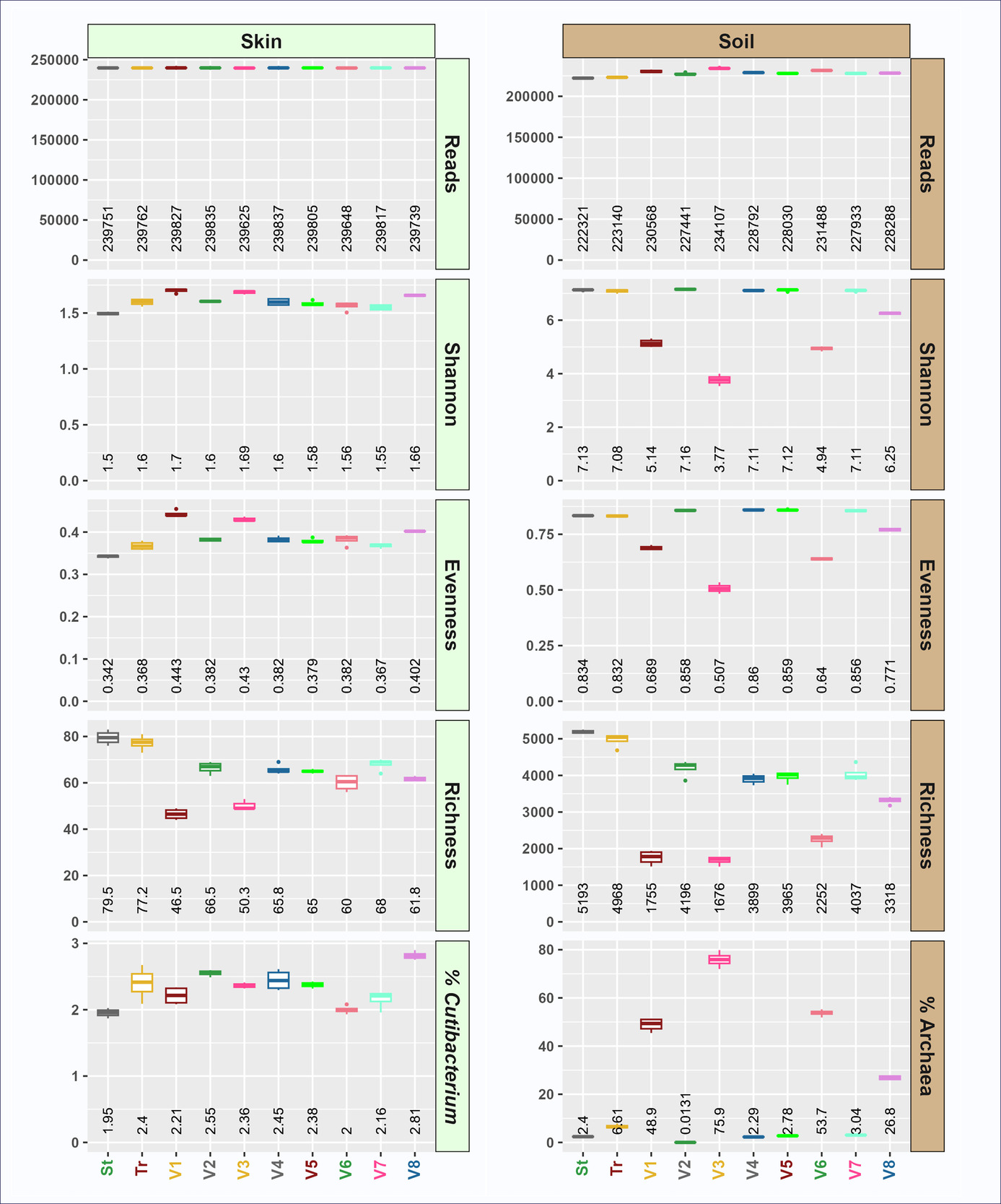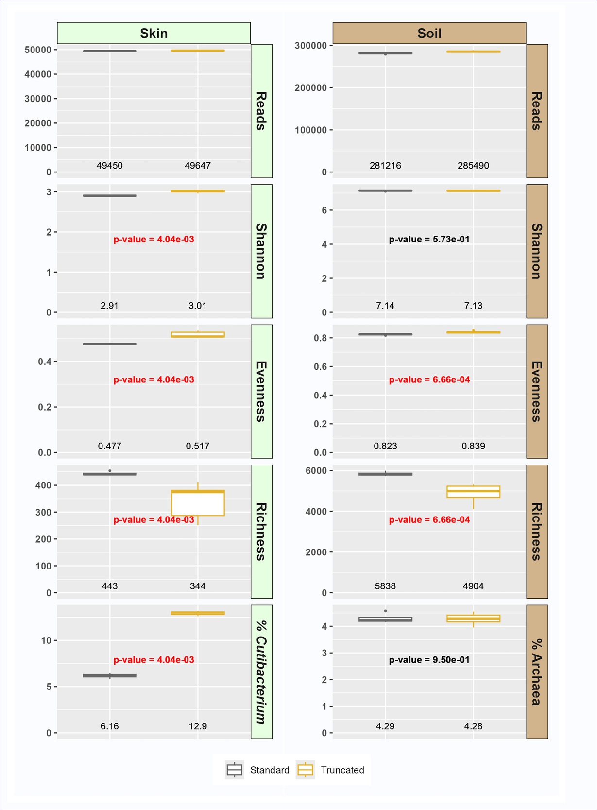 To evaluate the impact of the redesigned primers on sample characteristics, metrics for alpha diversity and representative taxa were calculated. Although overall alpha diversity was similar between primer sets, several trends were observed. First, taxonomic richness at the ASV level was significantly lower with the truncated primer set relative to the standard primer set (Figure 2). Conversely, evenness was significantly higher in the truncated primer set, resulting in Shannon indices that were not significantly different between primer sets (soil) or slightly higher in truncated primer set data (skin) (Figure 2). The relative abundance of sequences from the domain Archaea was not significantly different between primer sets in soil, but the relative abundance of Cutibacterium was significantly higher in the truncated primer set (12.9%) relative to the standard primer set (6.11%) in skin (Figure 2). Bacteria from the genus Cutibacterium (formerly Propionibacterium) have known mismatches with the standard 515F/806R standard primer, with mismatches either at the 3’ end (806R primer) or near the 3’ end (515F primer).28,29 The presence of mismatches between primer and template, especially mismatches close to the 3’ end of primers, has been shown to significantly reduce PCR amplification of target DNAs, leading to underestimation of the true abundance of the target.1,30 In this study we demonstrate that by truncating primers at 3’ ends and providing a cascade of primers with different 3’ ends, we can both overcome difficulty in detecting Cutibacterium while maintaining overall similarity of the total microbial community. The truncated primers are better able to amplify Cutibacterium because almost all primers in the tr515F/tr806R pool do not contain the 3’ bases with mismatches to the Cutibacterium template. This resulted in a doubling of the relative abundance of Cutibacterium in skin samples while still maintaining similar levels of overall diversity (e.g., Shannon index; Figure 2). The truncated primers do not appear to have negative impacts on systems without Cutibacterium, such as soil.