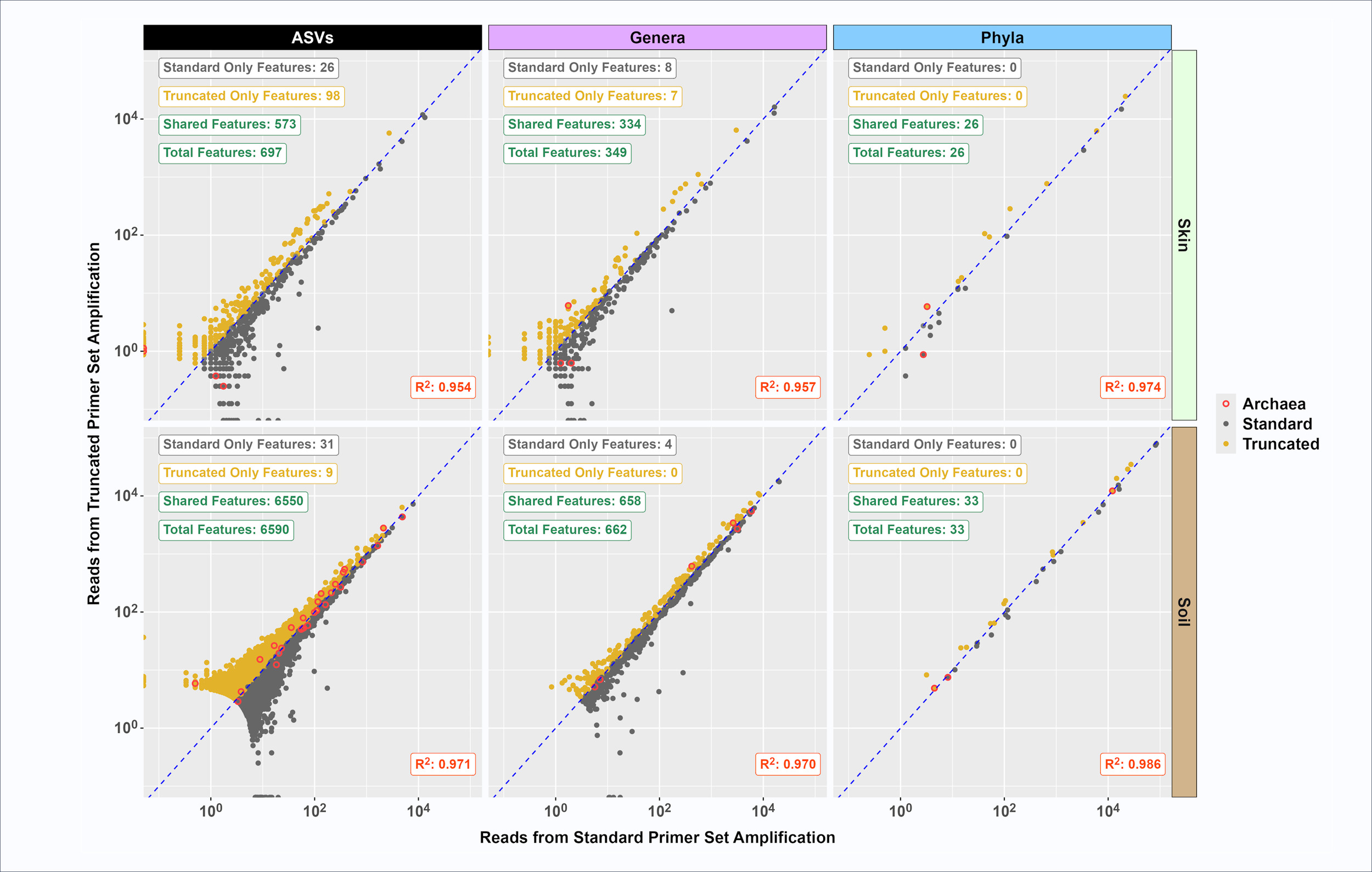 To look more closely at similarities in observed microbial communities characterized using standard and truncated primer sets, the average relative abundance of each taxonomic feature (ASV, genus and phylum) from the standard and truncated primer sets was plotted (Figure 3). High correlation values (RP2P>0.95) were calculated for skin and soil at ASV, genus, and phylum taxonomic levels. Most features were shared between the primer sets, with relatively few features found only with standard or only with truncated primer sets. For example, out of 6,590 ASVs observed in the composite soil sample, 31 were found only with the standard primer set while 9 were only found with the truncated primer set. In the composite skin sample, the truncated primer set detected more unique features relative to the standard primer set. Specifically, 98 unique ASVs were identified with the truncated primer set as compared to 26 unique ASVs with the standard primer set out of a total of 697 ASVs (Figure 3). There were fewer genus-level unique features detected (i.e., 8 skin genera uniquely detected with the standard primer set as compared to 7 unique genera detected with the truncated primer set and 4 unique soil genera detected with the standard primer set versus no unique genera detected with the truncated primer set). No unique phyla were detected between standard and truncated primer sets in either skin or soil (Figure 3).