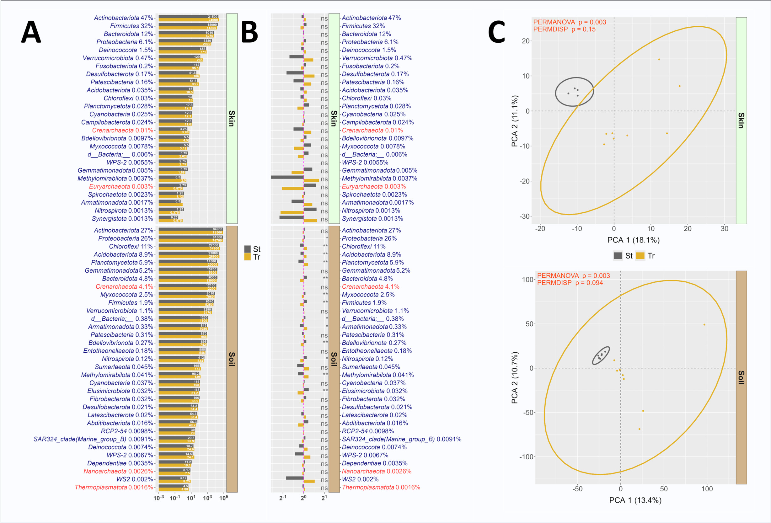 In contrast to the marginal effects of the pooled primers, the individual truncated primer variants exhibit distinct characterizations. Notably variants 1, 3, 6, and 8 yielded dramatically elevated relative abundance of sequences annotated as Archaea (Crenarchaeota, Nanoarchaeota and Thermoplasmatota) when amplifying soil gDNA (Figure 6A, 6B) consistent with trends observed in Figure 5. Of this Archaeal-enriching group, variants 1, 3, 6 (shades of red) strongly diverged from pooled primers (St and Tr) and other individual variants (Figure 6C). The remaining variants (2,4,5,7) either converged with the pools (Skin) or diverged slightly (Soil).