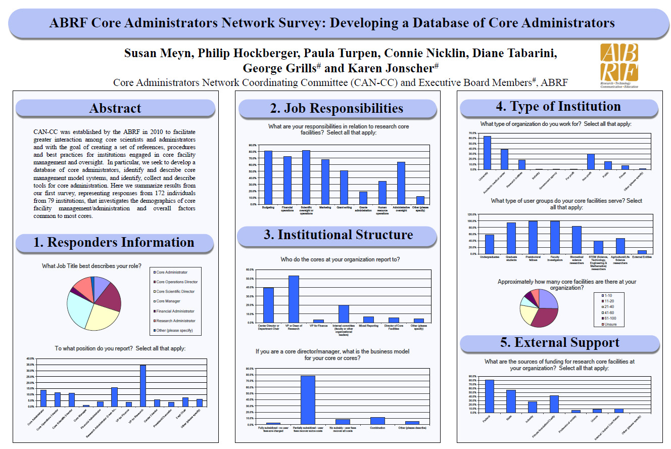 In 2012, CAN presented a poster at the ABRF Annual Meeting in Orlando, FL, summarizing a survey of core administrators (Appendix 1 shows an image of the poster). The survey captured job descriptions and responsibilities, institutional types, oversight models, and funding sources for core facilities. CAN also hosted an interactive roundtable, Models for Core Management and Administration: Perspectives from members for the Core Administrators Network. These well-attended activities led to three outcomes with broad and lasting impact: